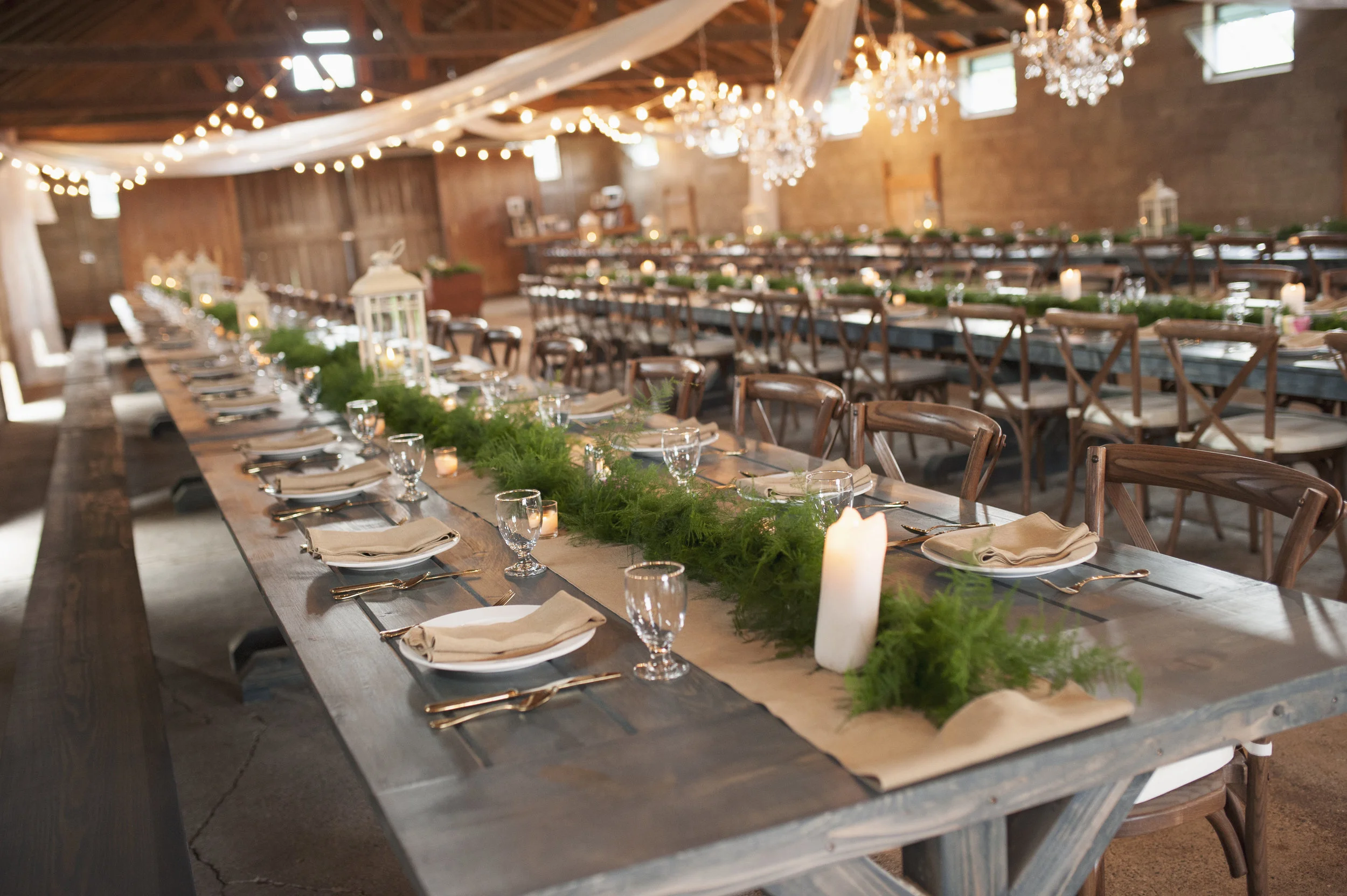 They transformed their blue boat barn into a magical space to host our dinner reception, with long farmhouse tables, unique benches and chairs. My vision included rustic table runners of cheese cloth and natural greenery. I did not want to take away from the beauty of the barn’s interior. Additional touches included hanging white drapery with soft lights to enhance the tall beams and magnificent architecture of the historic barn. Furthermore, we had large wooden wine barrels and rustic wooden platforms for our bar that reminisced the 1920s.